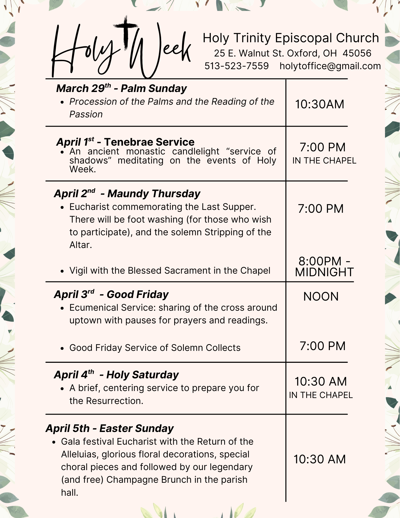 Worship, learn, and serve with us. We are a progressive expression of ancient Christian traditions. Totally LGBTQIA+ equal and affirming. For more information, please contact The Rev. Julie Fisher by e-mail at revjuliefisher@gmail.com. You may also call the church office at (513) 523-7559 or e-mail the office at holytoffice@gmail.com.