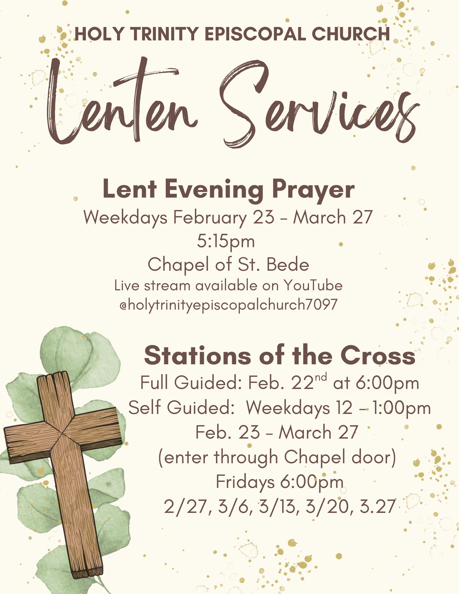 Join us for a meaningful, self-paced journey through the Stations of the Cross. This devotional practice offers time for reflection, repentance, and renewal as you walk with Christ toward the cross. Printed guides are available, and you may come and go as your schedule allows. Please enter through the Chapel Doors.